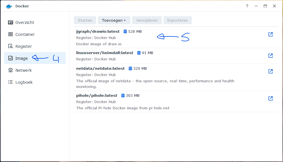 4) Klik in de linkerkant van Docker op Image en je krijgt in de rechterkant alle images te zien
