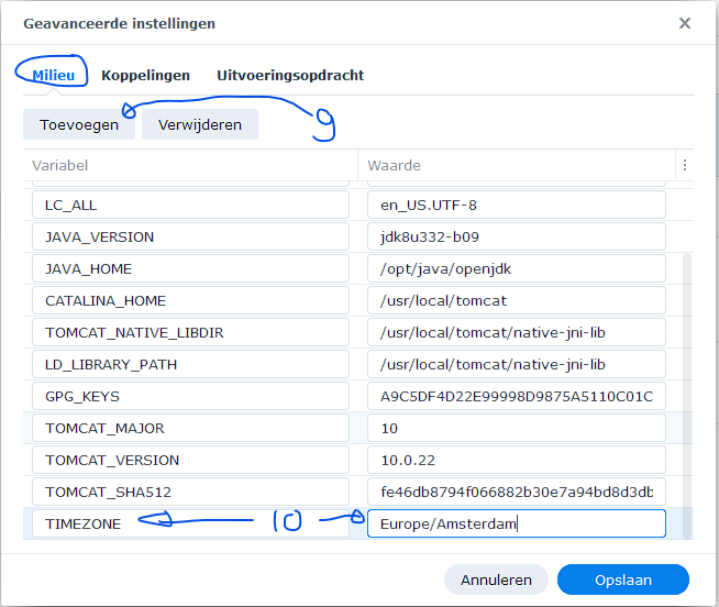 10) Vul hier het volgende in “TIMEZONE” en daarachter je tijd zone, voor mij is dat “Europe/Amsterdam”, maar jou kan dat heel wat anders zijn.