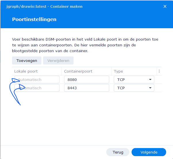 Voor de poorten zul je poorten moeten kiezen die nog vrij zijn, je kan alleen in de linkerkant de poorten aanpassen, de rechterkant (8080 en 8443) mag je niet aanpassen, ook ’type’ laten we op ‘TCP’ staan.